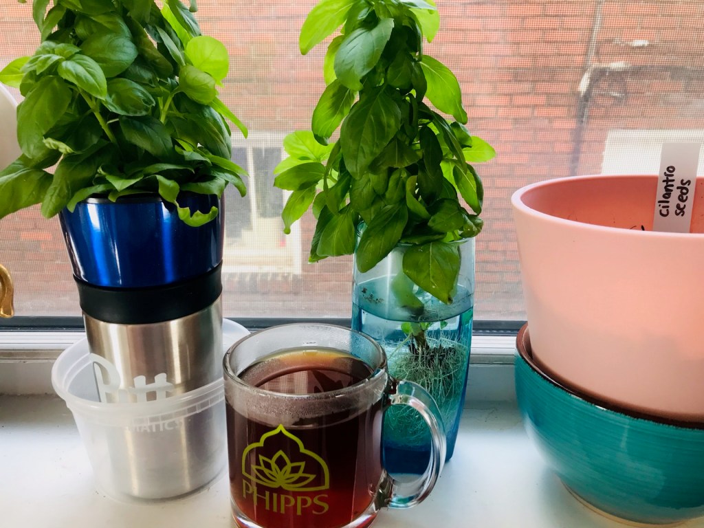 At this point, I have two basil plants doing well and cilantro newly planted. My lemon balm seeds just came in the mail, so within the week I’ll have lemon balm planted as well!