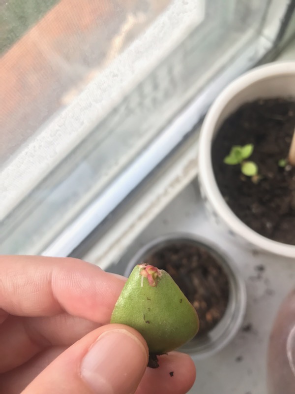Just when I’d given up on my jade prop going anywhere, I looked and – voila! – there’s growth! It took a while, but we’re getting somewhere now. In the second image you can see a little tiny baby pink growth – until it gets a little bigger I’ll continue to water this guy by picking him up and wetting the soil he sits on, then replacing him.