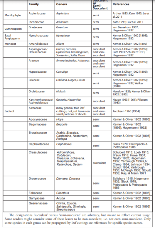 Leaves best grow new root and shoot meristems when they have lots of parenchyma, store lots of water, and have low surface-to-volume ratios.