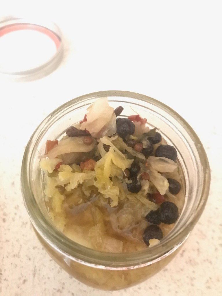And I say: HOLY SHIT, DELICIOUS! Homemade pickled cabbage fermented with pickling spice for a week? BIG YES!