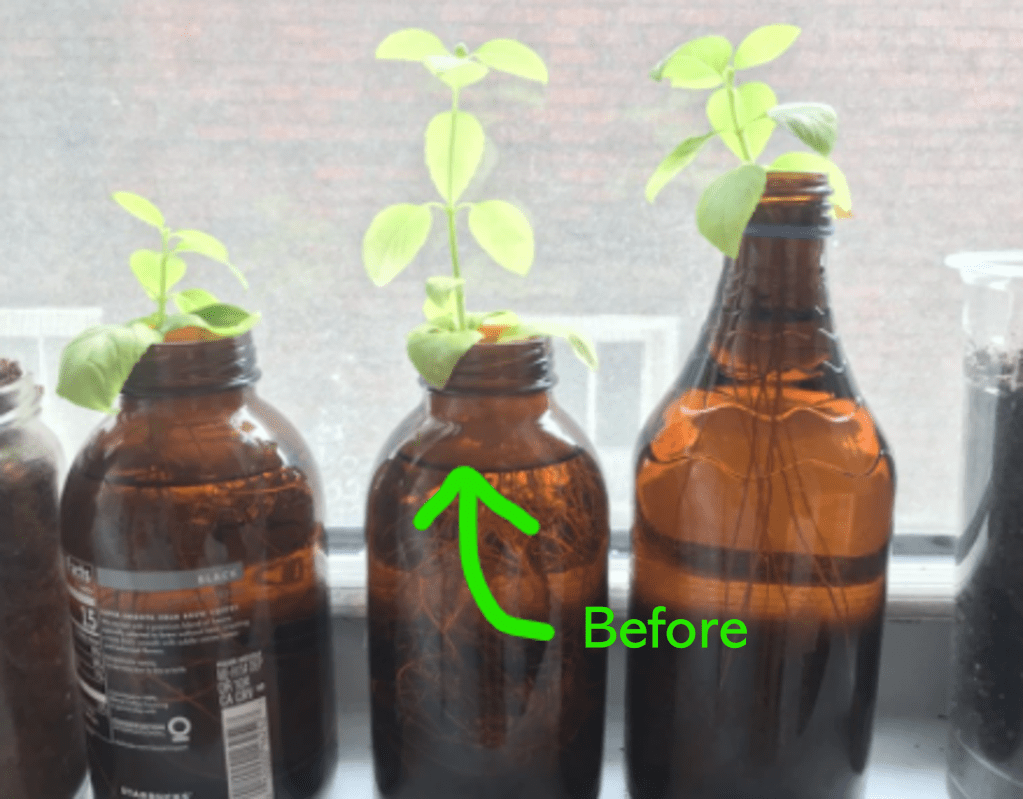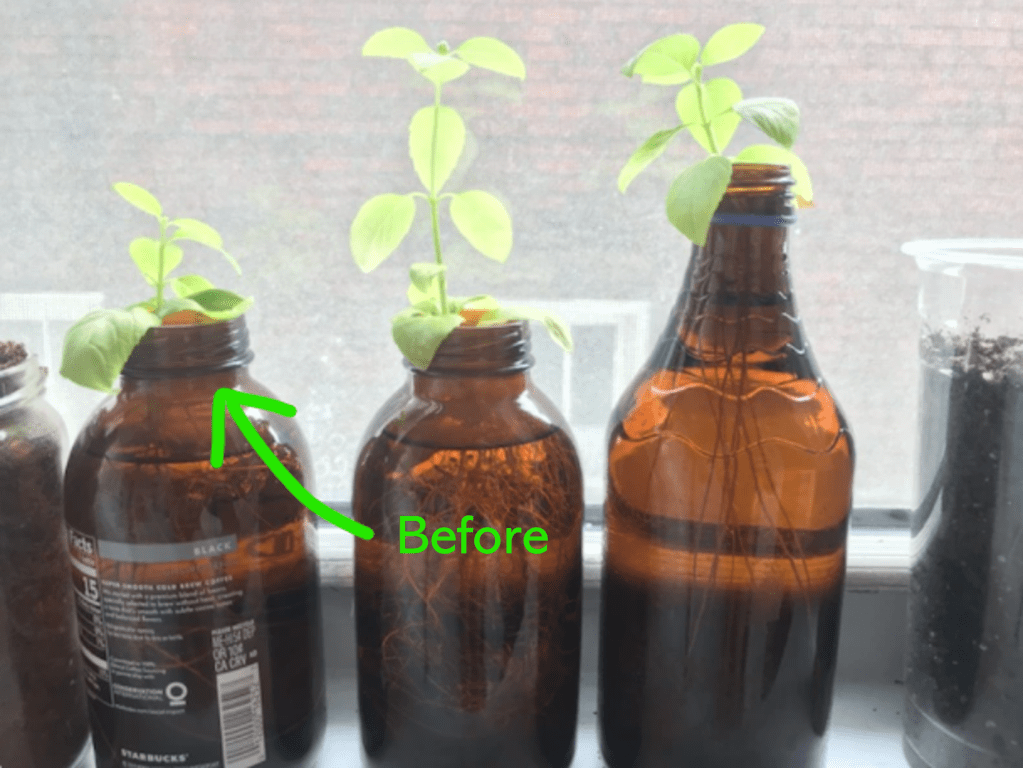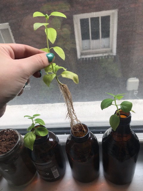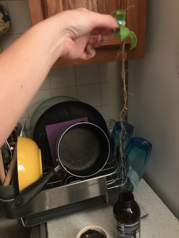 Now, not all three of my current basil-ettes will be going in soil. Only the original two, which have the most robust root structures an are starting to outgrow their watery containers, will be planted today. That’ll help them thrive and also make room for more little basils to be propagated.