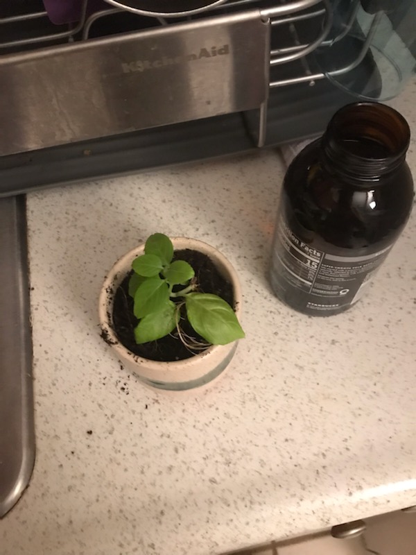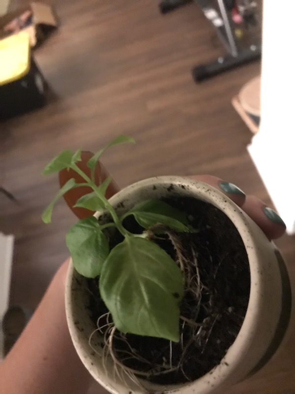 I had to do a little thinking on this one. Initially I was concerned because of the length of the smaller basil’s roots – I don’t want to crush this bigger dude’s roots! Then I thought – the roots probably elongated like that to spread out and search for nutrients. In a nutrient-rich soil, shouldn’t they not need all that size? As long as I’m gentle, shouldn’t it be okay? I then consulted one of my new favorite books, Lessons from Plants by the totally rad Beronda L. Montgomery. See page 60: