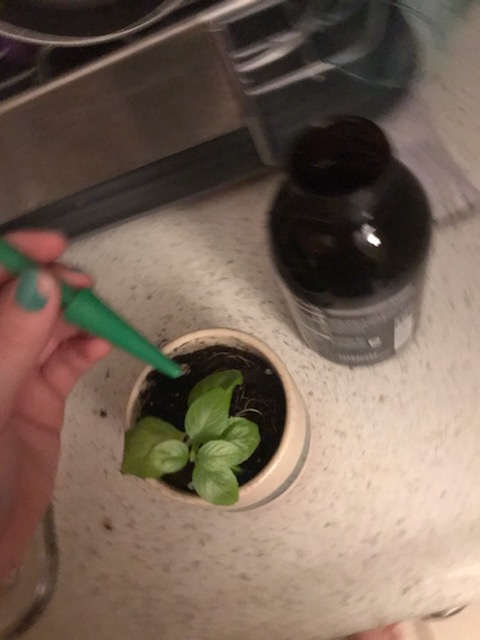 As for fertilizer, I’ve read that that’s a very good idea for indoor basil and it’s something I use for my houseplants anyway, as you might’ve seen in this prior post. Joyful Dirt, the stuff I use, is organic so I’m fine to use it on plants I’m going to eat from (like the basil.) I’ve actually used small amounts directly in the adult basil plants’ water before. My one concern is that these baby basils are still young, so I don’t want to burn them with fertilizer; I’ll only use a very small amount in the top layer of soil and gently water it into their new homes.