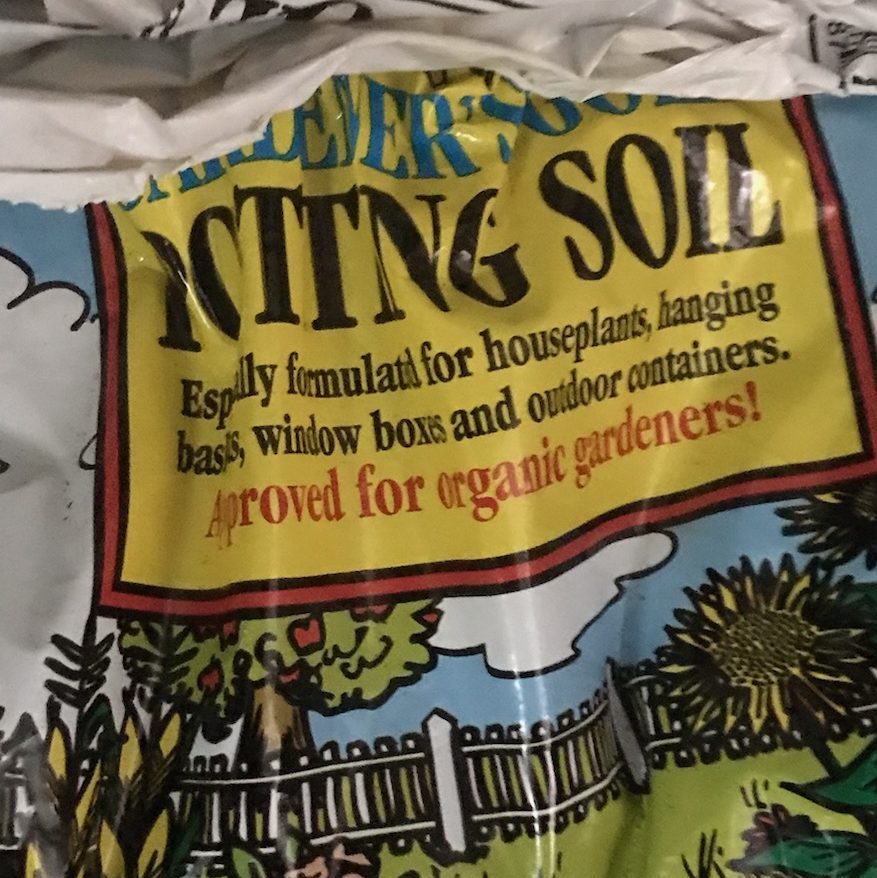 I use a nice, inexpensive, organic-gardening-approved potting soil from my local nursery. I strongly recommend talking to the nursery staff; that’s who pointed me to this bag, plus I got to meet the nursery’s resident cat.