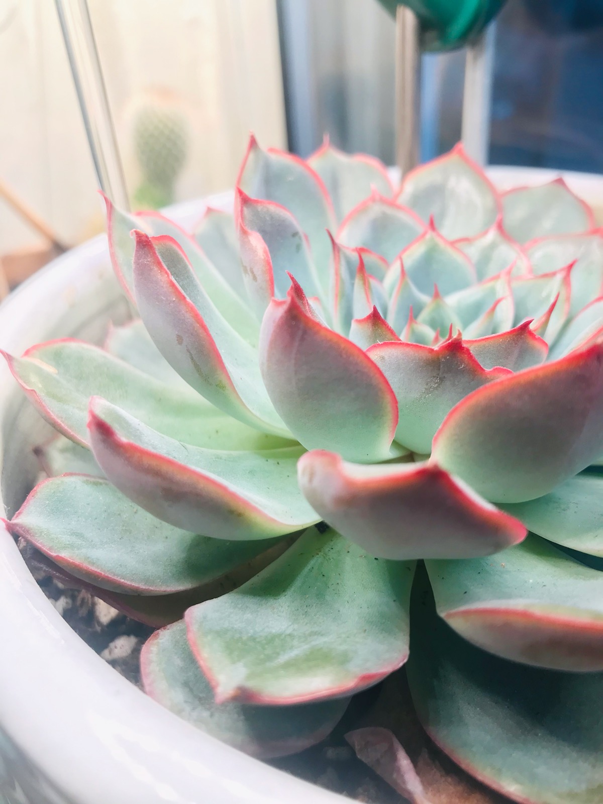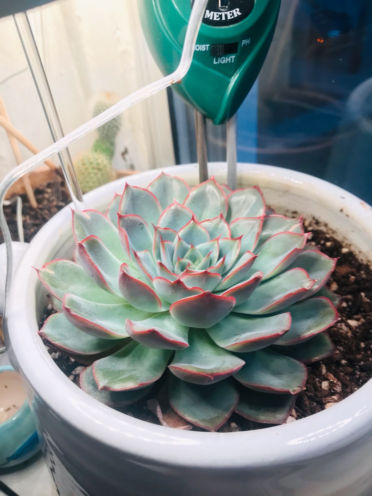 It took (a) used coffee grounds about every other week, (b) carefully-planned watering, (c) a moisture/pH/light meter, and (d) loving pruning to get this guy healthy and succulent again. And it was worth it! Although the soil doesn’t seem to actually be at perfect pH levels for an echeveria, look how happy this guy looks! You can see how thick the leaves are looking and how much better his color is than it was. He’s still in his same southern window, with supplemented light as needed for the winter from a trio of grow lights.
