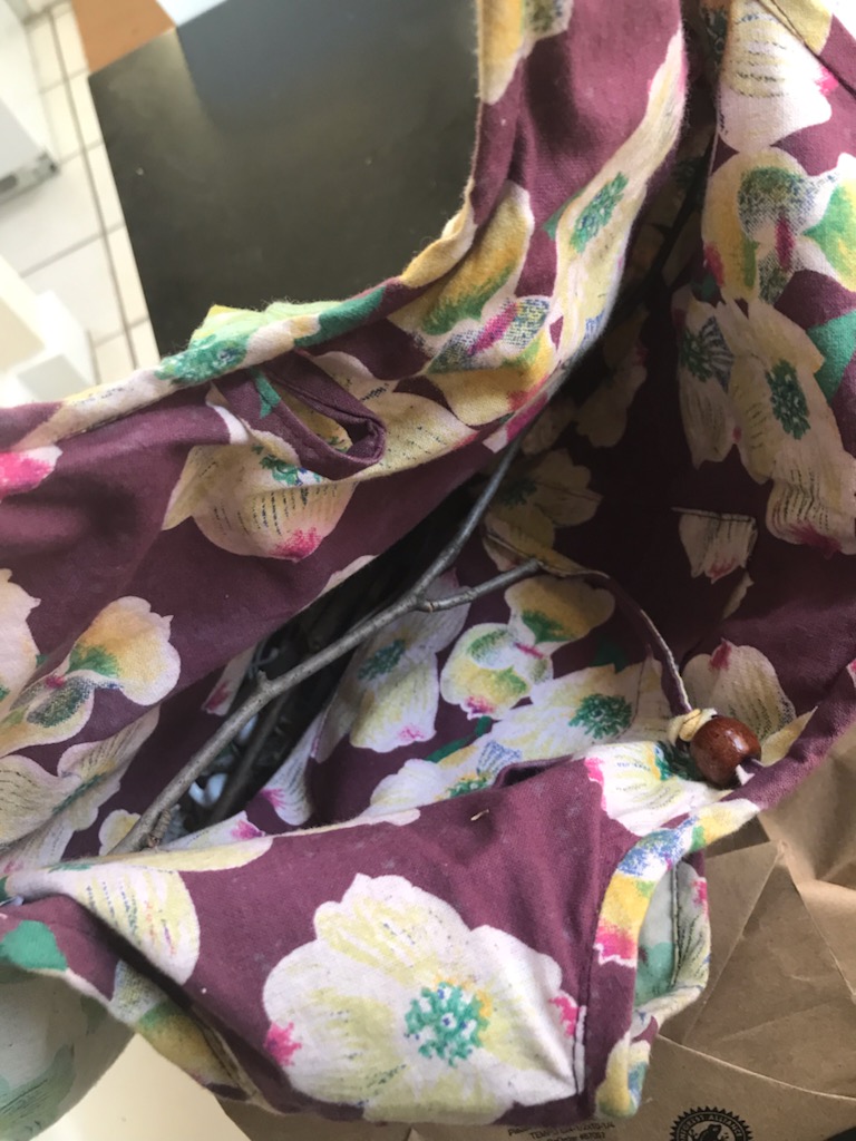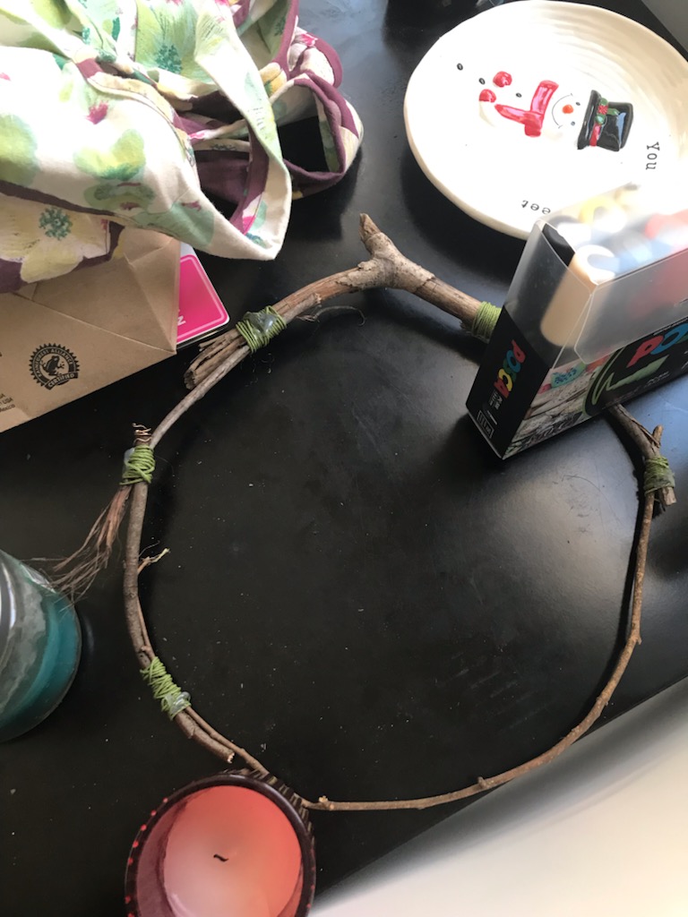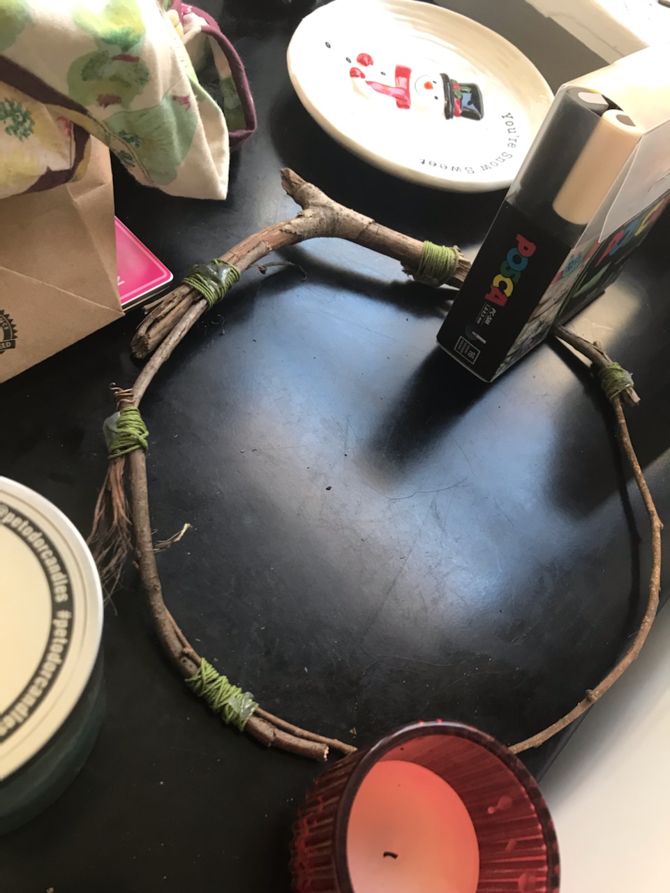 Here’s the wreath so far: I’ve used hemp string from my local art store to tie the sticks together and some hot glue to secure the string. Now, to make that circular shape I was lucky enough to find some pre-bent sticks but I also used the flexibility of wood to bend the final stick (the longest one you see there) into place. I gently maneuvered the wreath into the shape I wanted it once everything was tied together and then used my laptop and some heavy candles to ‘press’ that shape/hold it still. I left it like that for almost 24 hours, and voila! a rounded wreath. Next steps are to add some finishing touches, namely some hemp string details, make a loop at the top (the knobby part; isn’t nature wonderful! Mother Nature is the queen crafter) so that it can hang peaceably at my door. I imagine coming home and seeing my handiwork every day will bring me an extra ounce of joy on top of the ounces of joy spring itself brings!