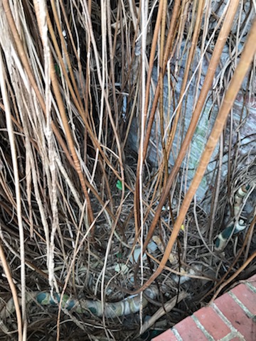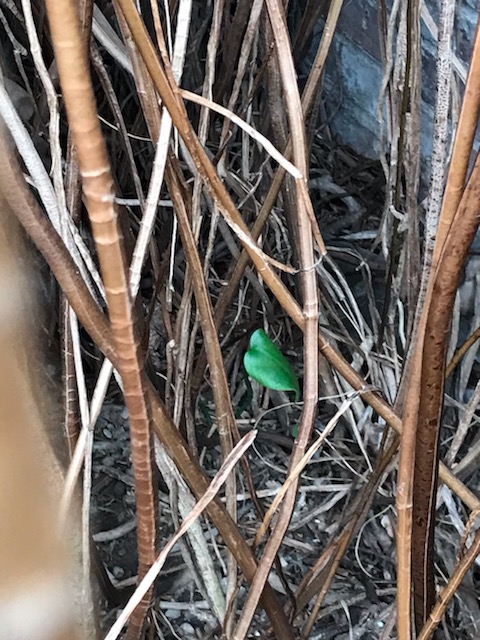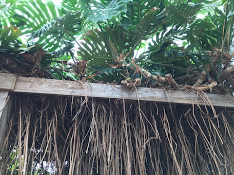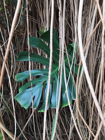 Look at that little leaf, growing among the thick aerial roots of a Swiss Cheese Plant! I wonder what it is, and how old it is, and how it got there? It seemed to be a separate plant, as there was a stem growing from the ground. It almost looks like pothos but I’m not sure. Ah, the incredible resiliency of flora.
