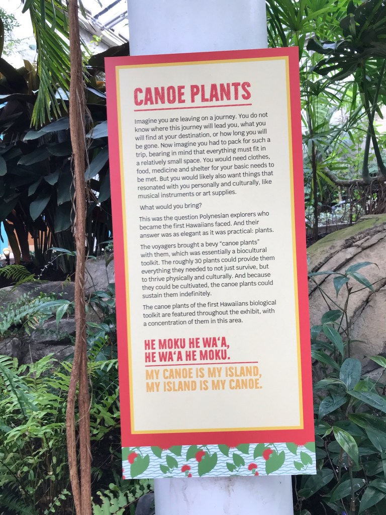I don’t want to paint too dark a picture of things here, because I do believe and want to believe that there is hope for our planet’s ecosystems beyond us. Plus, I think we all know what colonizers did to the Hawai’ian islands. So I’ll skip most of that discussion here while still including important points from Phipps’ newest installation, Tropical Forest Hawai’i. The positive and beautiful side here is how native Hawai’ians and Polynesian seafarers lived as part of their land. The Phipps Tropical Forest Hawai’i room does a lovely job of showcasing that.