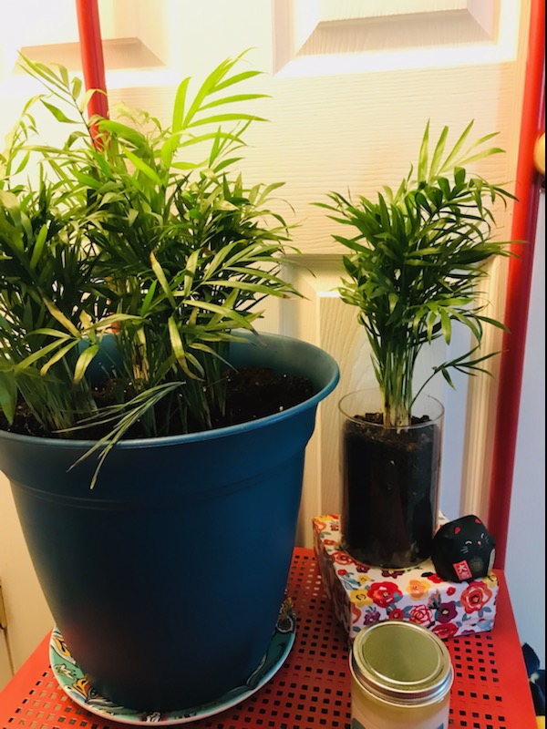 What I bought today was a 6-inch parlor palm. I then separated it into four separate plantlets, three of which are surrounding Adora (you can see her, still a little brown and wobbly, at the front of the pot) and one of which is in its own recycled-Jiggy-puzzle-container pot. And, fun fact: the little floral pedestal that pot stands on is a recycled Jiggy container top that I put some of the extra decorative contact paper from my fireplace on.