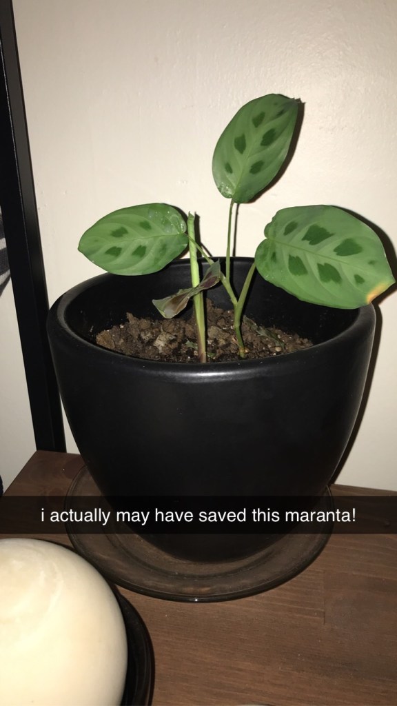 Last but not least, I actually *might* have managed to save my withering prayer plant! They can die back in the winter, and this one died back fast all of a sudden. But, now there’s new growth! I did notice a few tiny spots of what may have been powdery mildew during plant care today, but I gently wiped them off (they came off with no trouble) and used some neem oil. I’ll keep my eyes peeled.