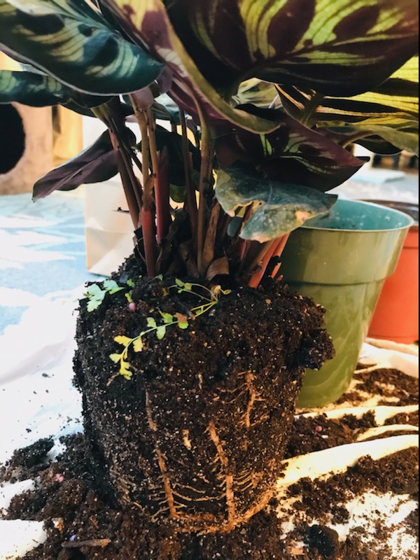 There was an extra little plant baby inside! The shop owner was kind enough to give me a little mini pot to grow the button fern in, but I figured since it’s happy to grow alongside this calathea I’d rather not disturb their relationship. So I had to repot very carefully: