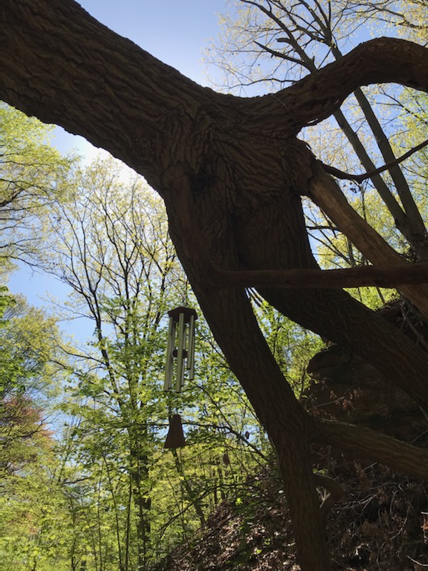 So while out in the woods, I followed a small relatively quiet trail farther than I’ve ever taken it. I got to revel in the gurgling sounds of a little creek with little waterfalls, and I saw a rogue windchime out there! Normally I’m not into adding unneeded extravagance to natural landscapes, but something about this windchime, out there on a quiet still day, painstakingly hung there and hurting no one, was… beautiful.