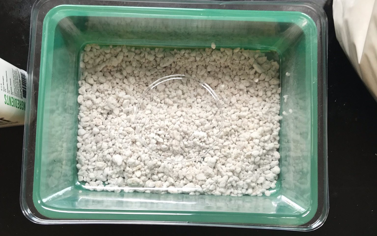 I took what would be the bottom of the seedling ‘greenhouse’ and filled it with perlite. This was to mimic where I would use rocks if I had any left or space between the bottom of a pot and the ground if outside, for drainage.