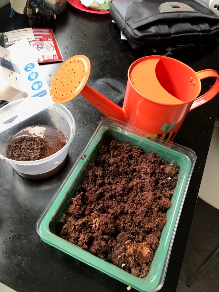 When that wasn’t enough soil, I went and used some of those packed-peat pellets you get with cute mini grow kits, like these Save the Bees kits I have yet to plant.