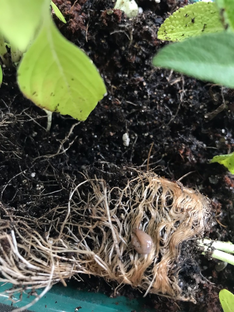 But you can just see it on the very-root-bound roots of the newly freed basil plant there.