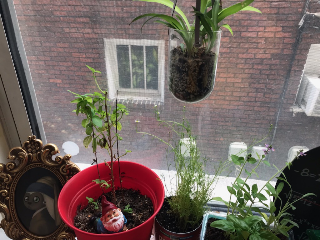 Now, as mentioned, I was out of money, out of new soil, and out of planters with proper drainage. So I opened up my hall closet and took stock of what I had available: and I found a forgotton stack of mini seedling ‘greenhouses’ that I was able to repurpose into a mini window garden container with drainage!