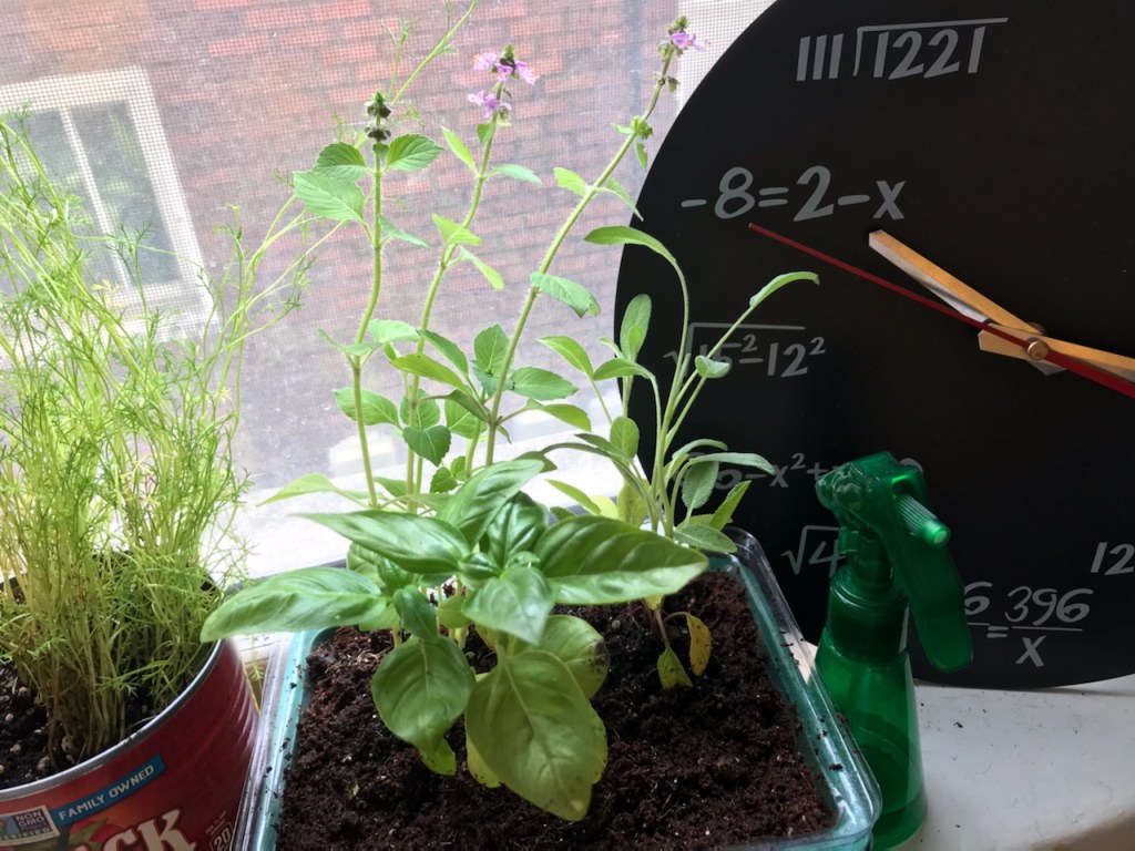 Well – I helped out with a super fun planting event earlier this week and got to take home a couple of the extra plants that there wasn’t enough space for! I feel very lucky – but I’m out of money, soil, and planters at my place. So I had to get thrifty with rehoming some chamomile, some sage, some holy basil, and some un-holy basil (ha ha).