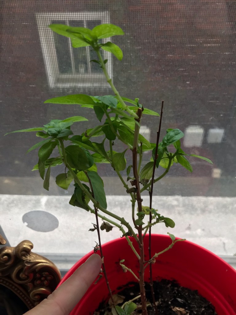 White willow releases a growth hormone (and is easy to propagate in just water, which is how I got my sapling). So when my original basil plant was super anemic and only very slowly/barely growing new stems and leaves, I gently pruned off two twigs from my sapling and placed them in the soil of my basil plant. And it looks so much less anemic! The new growth is green and proud, especially so on the side where the twigs are inserted: