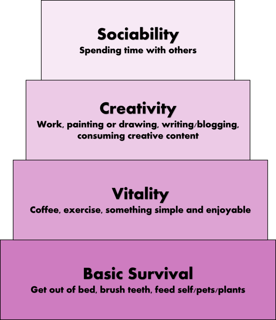 The idea here is that the bottom tier takes the least energy and is the basis for doing the activities at the upper tiers. So, for example, I won’t have the energy to exercise or relax into cartoon watching if I don’t get out of bed and feed the cats first. (I’d like to mention that depending on the day, coffee fits under basic survival 🤪) Then if I spend a ton of time just sitting around and not exercising, I won’t feel much like working on a painting. And if I don’t spend time doing something creative and spending quality time with myself, I won’t feel like spending time with others.